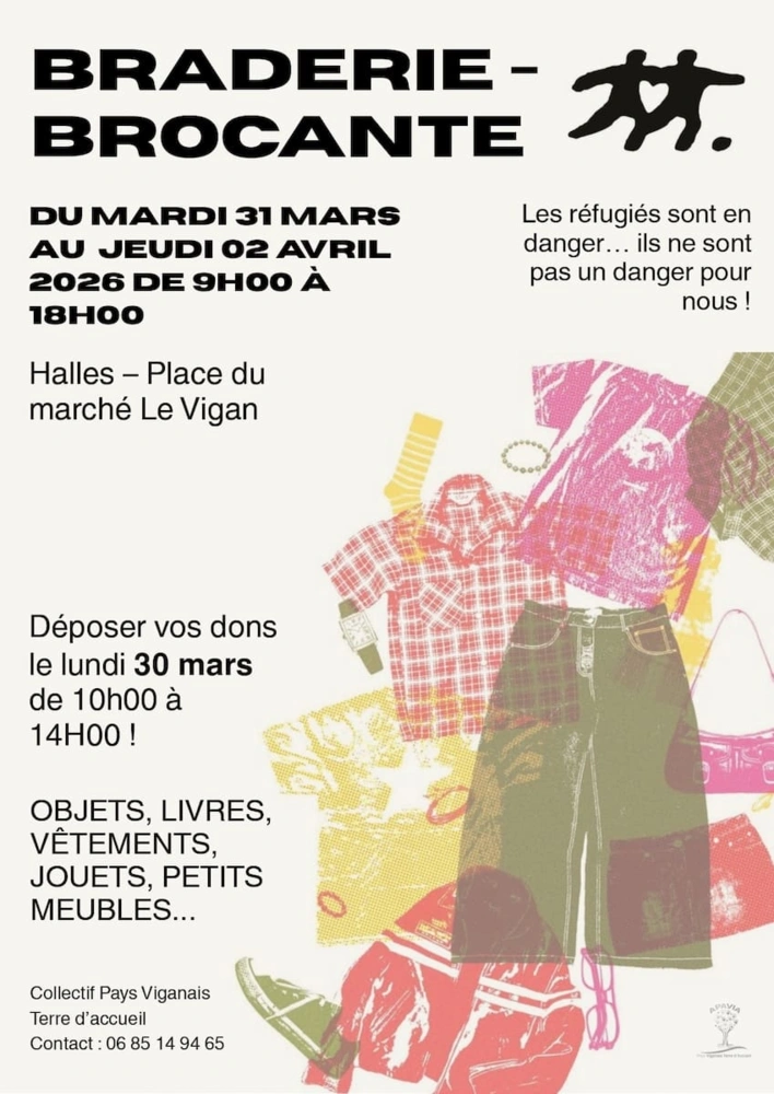 APAVIA, l'association du Collectif Pays Viganais Terre d'Acccueil fait sa Braderie-Brocante de printemps aux halles du Vigan du 31 mars au 2 avril 2026. sous les Halles du Vigan (Derrière l'Office de Tourisme).