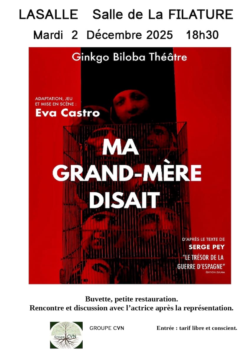 Le mardi 2 décembre, le Groupe CVN vous invite à une soirés théâtre à Lasalle, sur le thème de la guerre civile espagnole avec la pièce d'Eva Castro, suivie d'une discussion avec l'actrice.