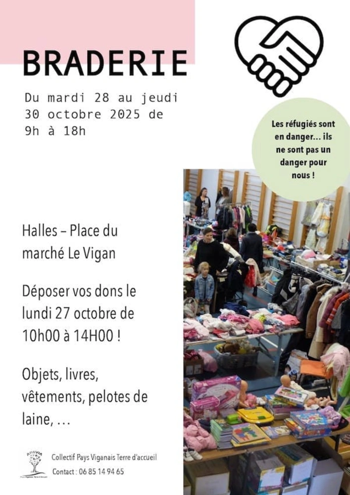 Vous pouvez déposer vos dons le lundi 14 de 10h à 14h00 aux halles du vigan.